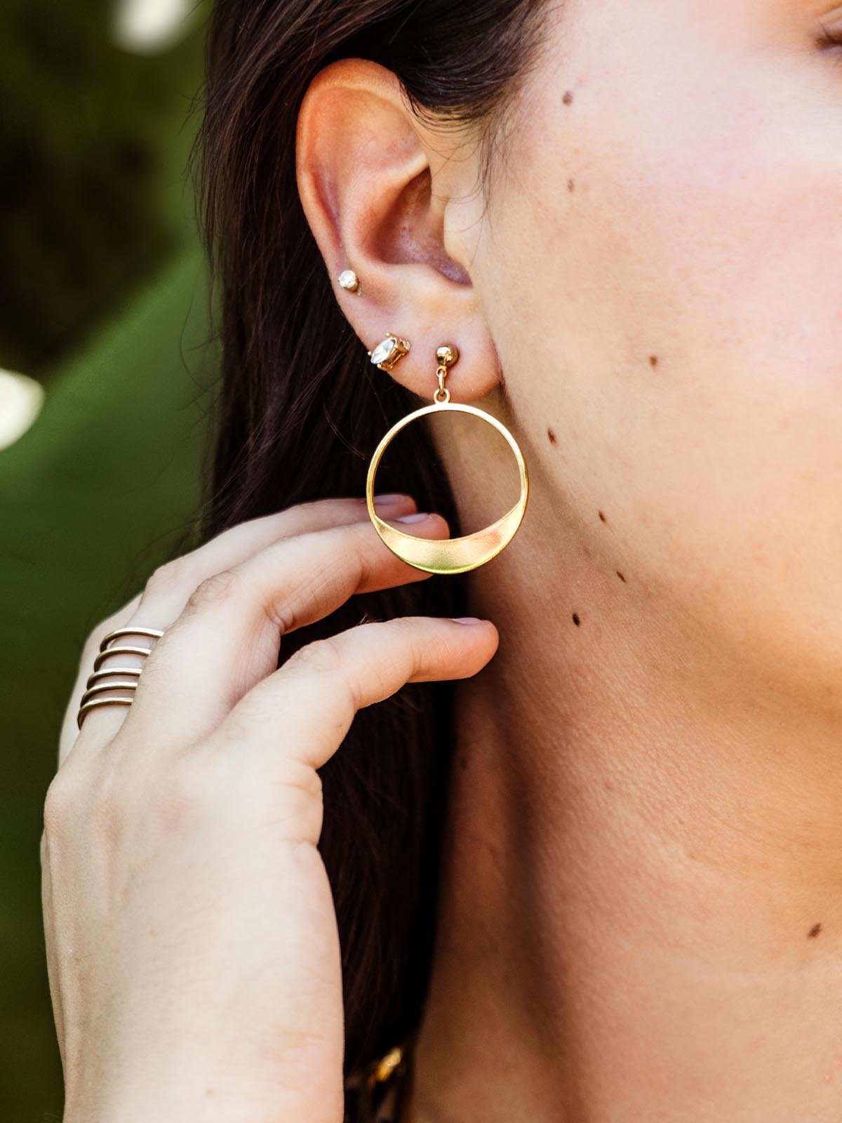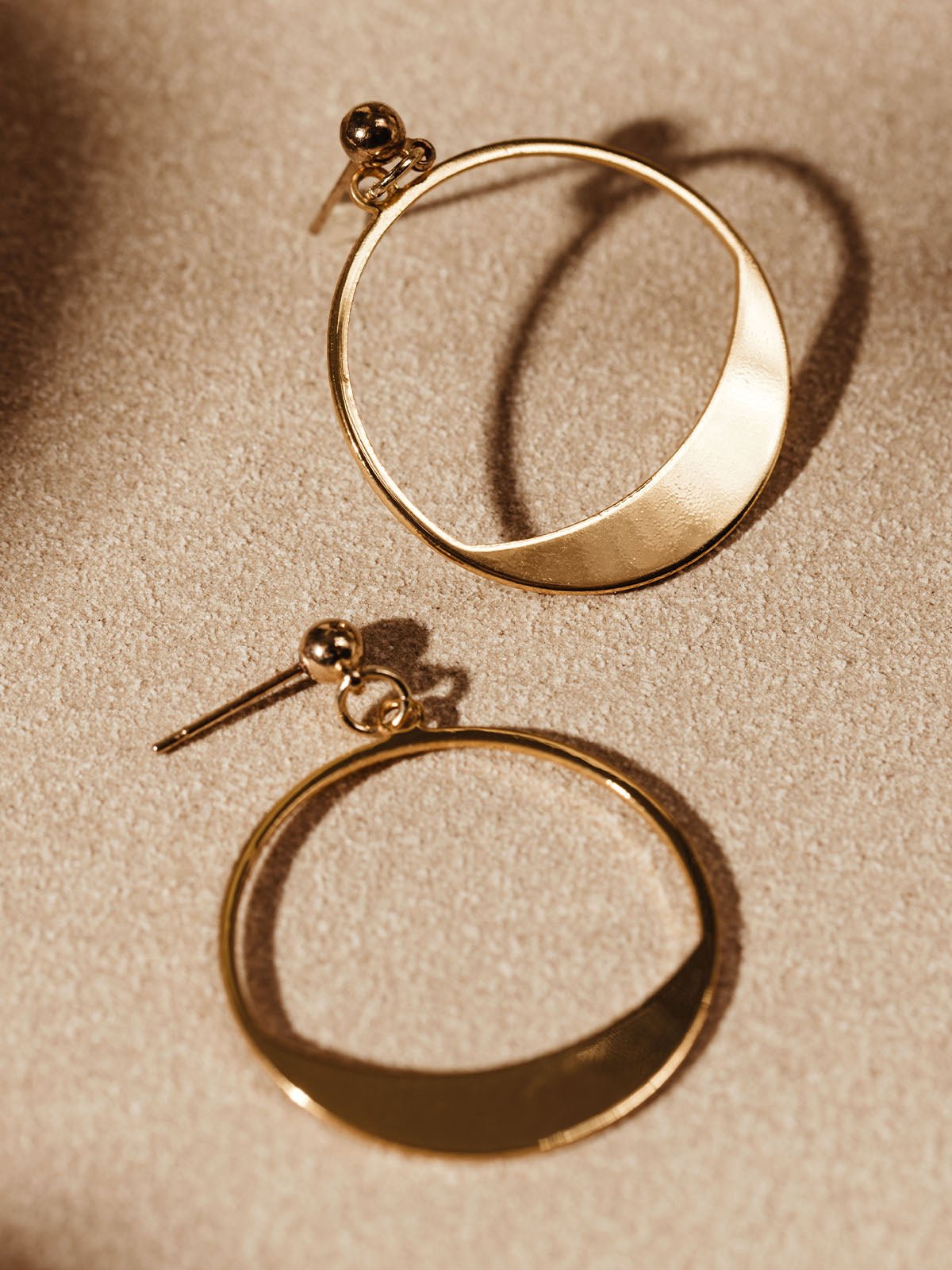 The Marcia Gold Earrings offer an elegant solution for those seeking shining gold hoops but with a post-earring style. Lightweight. stylish. and made of gold-plated brass. these earrings feature a small gold hoop that is slightly wider at the bottom for a unique twist on a traditional circle earring.